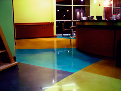Concrete floors can remain seamless, designed with saw cuts, stains colors on new pours can be integral or color can be applied after the pour and on existing floors, unusual aggregates such as marble or glass can be added, logo’s can be incorporated into the cement, terrazzo strip’s can be used to add an interesting look.